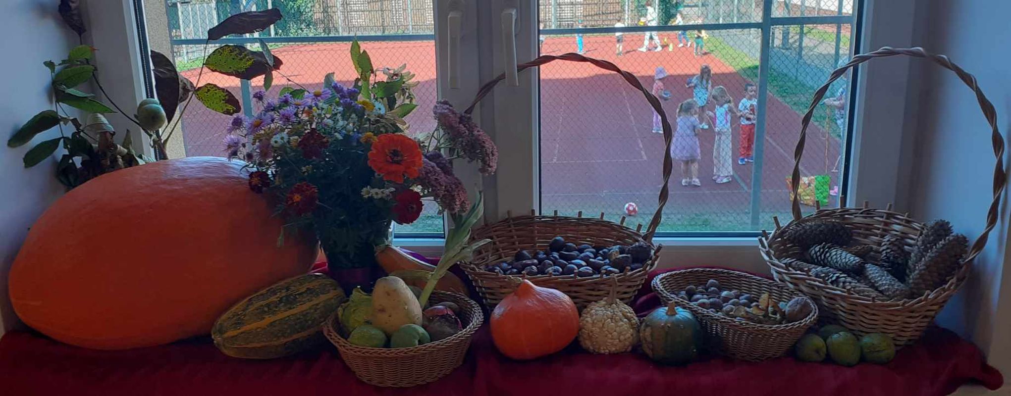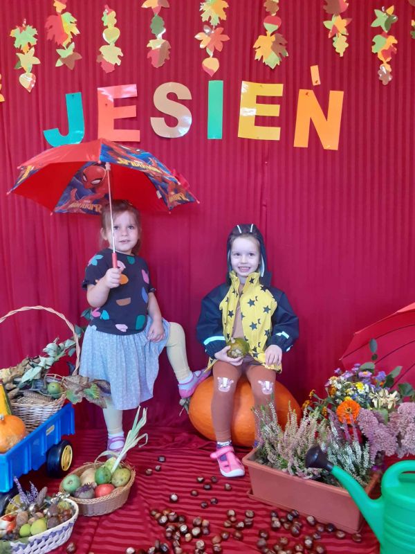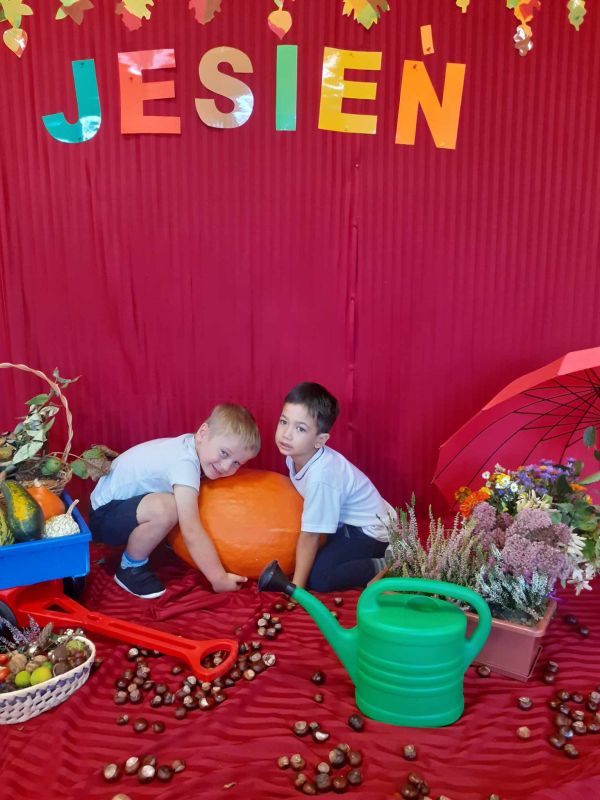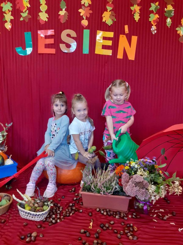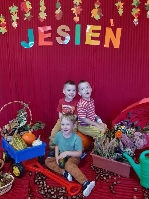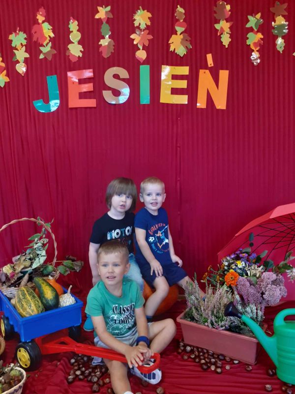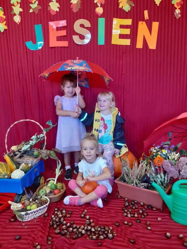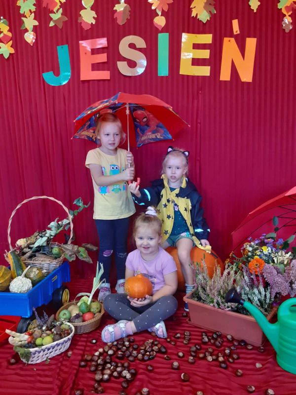 Przedszkolaki z grupy "Jagódki" powitały w przedszkolu jesień. Cały tydzień gromadziły dary jesieni m.in kasztany, żołędzie, dynie, szyszki, kwiaty jesienne oraz owoce i warzywa. Uczyły się je nazywać i przeliczały. Przedszkolaki z wychowawcami zrobiły jesienną wystawę, a na koniec tygodnia zaprezentowały się w pięknej sesji fotograficznej.