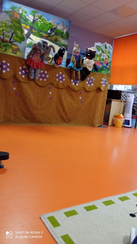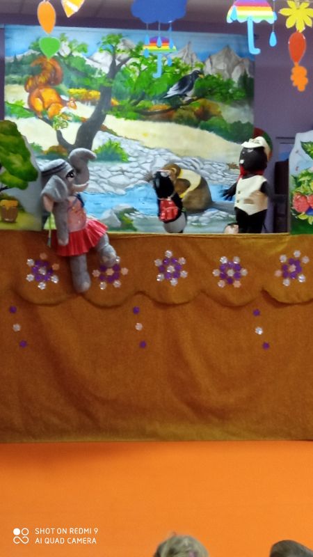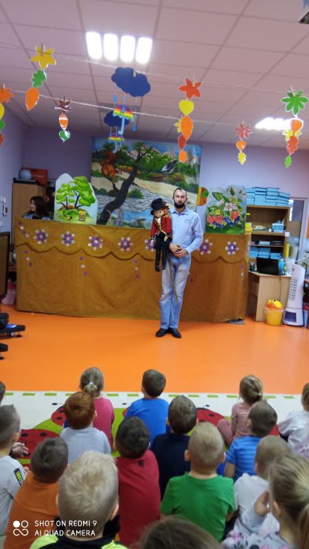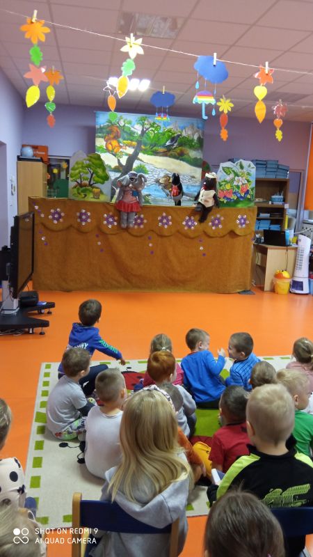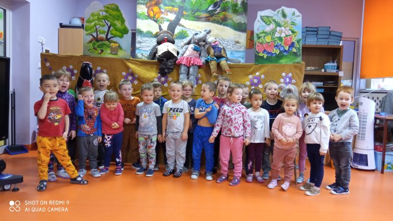 Odwiedził nas objazdowy Teatr Lalek Pinokio z Nowego Sącza. Przedszkolaki uczestniczyły w spektaklu „Kruszynka” opowiadający o Kruszynce – cyrkowej słonicy. Nasza Kruszynka nie lubi pomagać innym, jest samolubna i myśli tylko o osobie. Zwierzątka zmuszone są jej pomagać. W końcu słonica odkrywa że prawdziwy sekret przyjaźni polega na wzajemnej pomocy i akceptacji samego siebie i innych. Akceptujmy innych i samych siebie bez znaczenia kim jesteśmy i jak wyglądamy. Przedstawienie edukacyjne i pouczające. W sposób bajkowy pokazuje wartości przyjaźni, zrozumienia, akceptacji i pomocy potrzebującym. Bardzo nam się podobało.